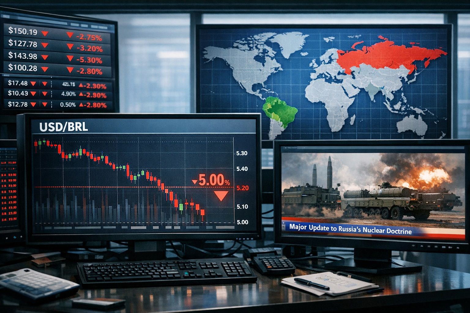 O movimento ocorre em meio ao aumento da aversão ao risco nos mercados globais, após relatos de que Vladimir Putin atualizou a doutrina nuclear da Rússia, segundo o MarketWatch. Ao mesmo tempo, o real encontra suporte em fatores locais, como expectativa de fluxo cambial positivo e reposicionamento de investidores.